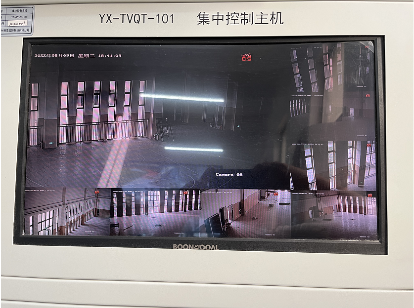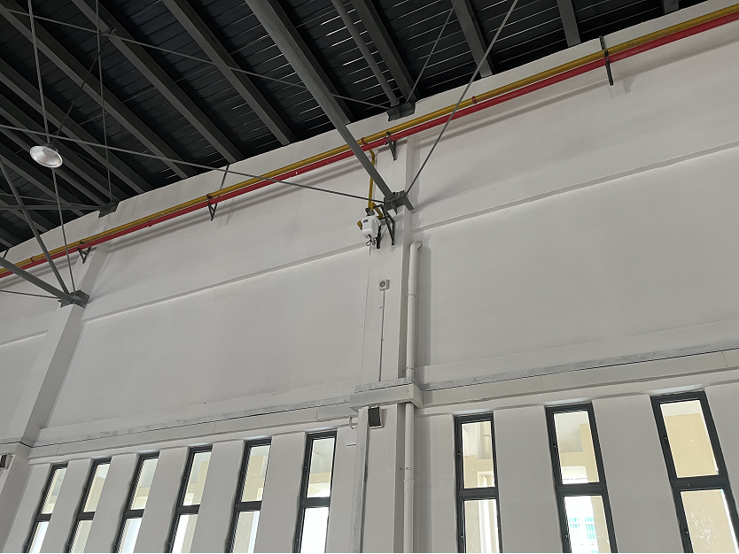 吴家山二中改扩建项目,其中篮球馆安装了苏州云盾的智能消防水炮,型号:ZDMS0.6/5S-YX30,保护半径30M,额定工作压力0.6MPA,接口法兰DN32,现场安装实图如下:
